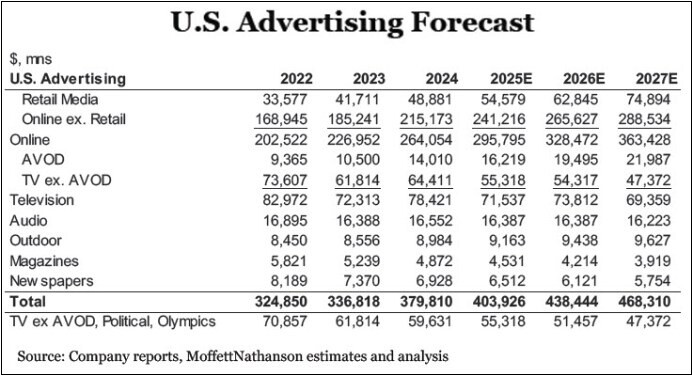 MoffettNathanson lowered their 2025 growth estimates for US advertising spend to 5.8% from 7.2%.