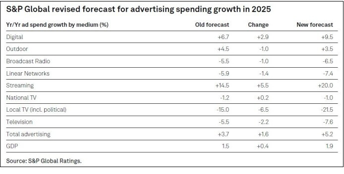 S&P Global raised 2025 growth estimates for US advertising spend to 5.2% from 3.7%