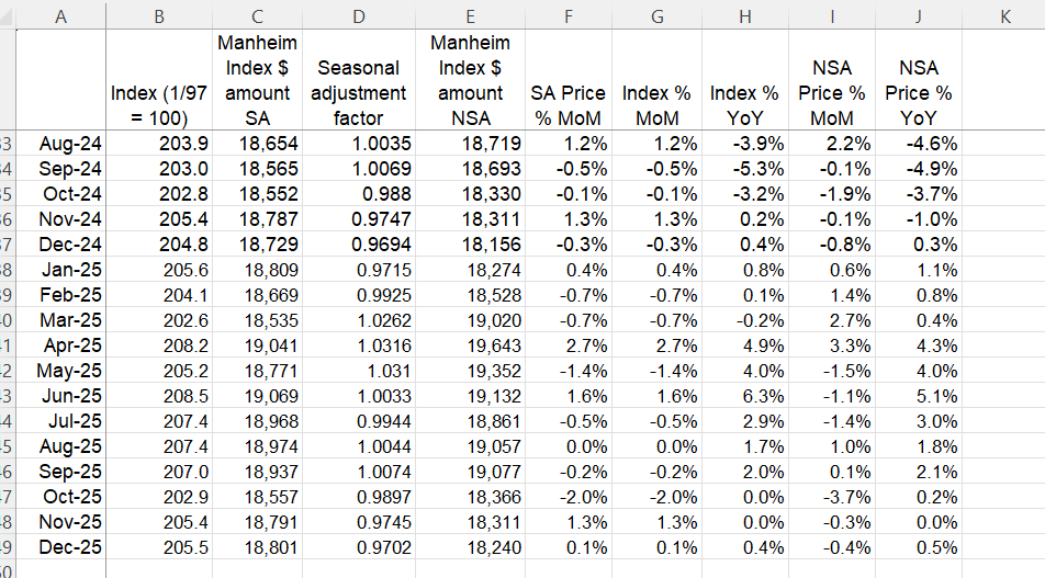Not seasonally adjusted (NSA) Manheim Used Vehicle Value Index fell 3.7%, 0.3% and 0.4% m/m in October, November and December respectively