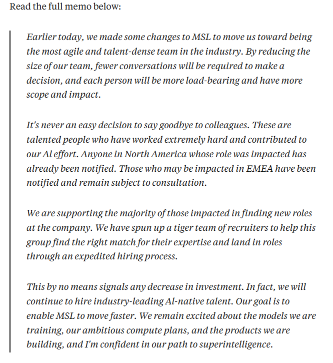 The job cuts will affect Meta’s FAIR AI research unit, product-related AI and AI infrastructure units, but will spare the TBD lab (in charge of developing next generation Llama models).