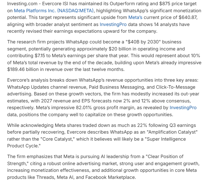 Outperform, $875: Evercore ISI said WhatsApp could become a “$40B by 2030” business segment, generating $20 billion in operating income and adding $7.15 to Meta’s EPS.