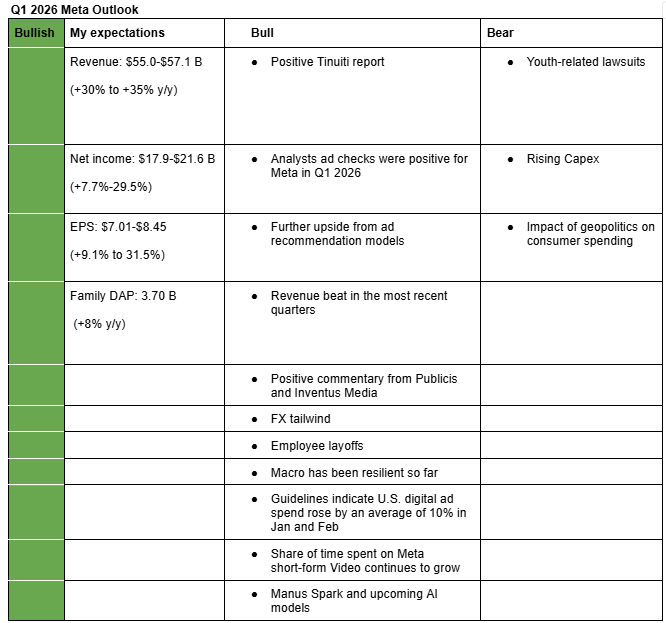 I am bullish on Meta’s Q1 2026 earnings and the company overall. My estimates (Meta Valuation Model (Google Sheets)) are based on positive Tinuiti report, positive ad spend checks, continued gains from Meta’s Ai-driven ad models, expected cost-savings from layoffs, assumption that capex will remain elavated, FX tailwind, and Meta’s consistent guidance beats over the most recent eight quarters. Let’s dive in into my bullish and bearish arguments.