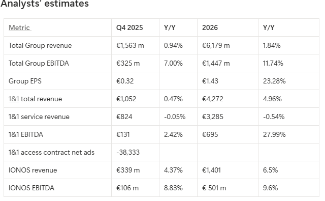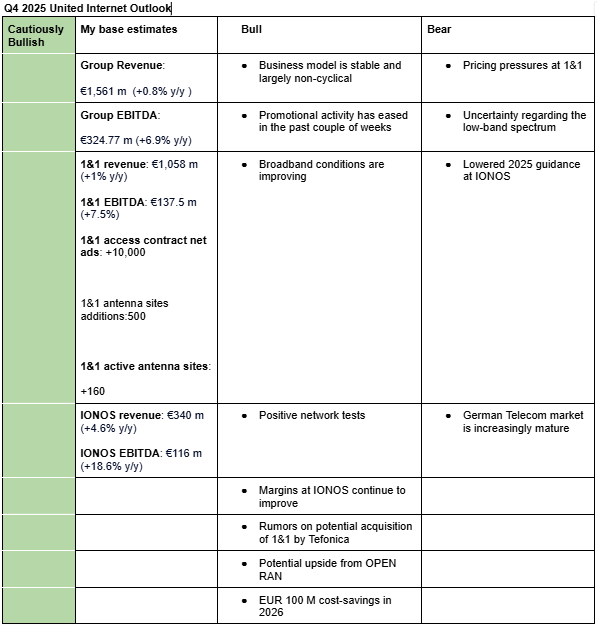 Cautiously bullish outlook on United Internet ahead of Q4 2025 earnings mainly due to current weakness at IONOS, pricing pressure at 1&1 and uncertainty on low-band frequencies