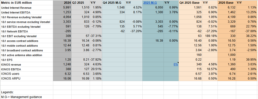 I am cautiously bullish on United Internet’s Q4 2025 earnings. My estimates (Valuation Model- Google Sheets) are based on comentaries from competitors, the fact that the industry is immune to macro pressures, guidance update by IONOS, positive network tests, end of customer migration and stable revenue from other business divisions. Here is a description of my bullish and bearish factors: