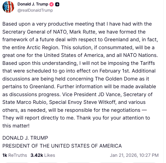 Trump calls off tariffs on the 7 European countries and the UK after reaching a framework of a future deal with respect to Greenland