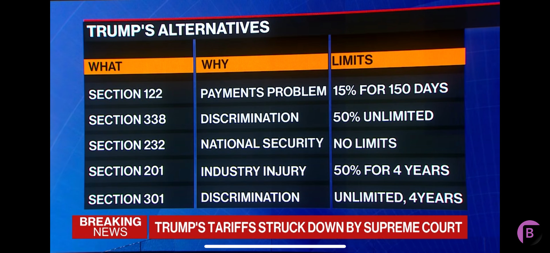 Following the ruling, Trump said he has a back up plan and Bloomberg policy analysts point out (second video) that his most immediate reaction is likely to impose 15% across the board for 150 days under section 122 as they assess and frame how they can use other laws such as Section 338 (50% unlimited), Section 232 (No limits), Section 201 (50% for 4 years), Section 301 (Unlimited, 4 years).